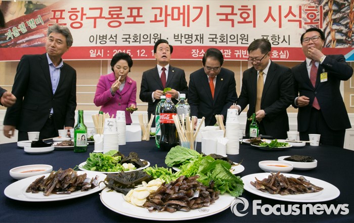 (서울=포커스뉴스) 1일 오후 서울 여의도 국회 귀빈식당에서 열린 포항구룡포 과메기 시식회 행사에 참석한 박명재(오른쪽 세번째부터), 이병석, 류지영 새누리당 의원과 참석자들이 과메기를 시식하고 있다.