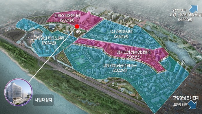 사업대상지는 GTX 등 교통 접근성이 뛰어나며 주변에 100만 평 규모로 일산테크노밸리, 킨텍스 제3전시장, CJ라이브시티, 방송영상밸리, 장항공공주택지구가 2024년까지 조성된다. 이러한 풍부한 주변 인프라와 연계될 경우, 고양시의 IP융복합 콘텐츠 클러스터는 R&D, 유통, 소비, 체험, 전시, 관광, 주거 등이 복합적으로 이뤄지는 메가 콘텐츠 허브로서 큰 시너지 효과를 낼 것으로 기대된다.