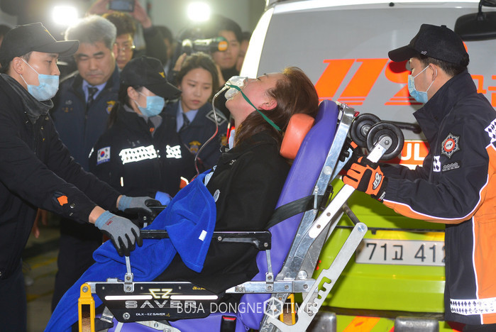 박근혜 대통령 비선진료 의혹을 받고 있는 성형외과 김영재 원장의 부인 박채윤 씨가 구속된 후 조사를 받기 위해 4일 오후 서울 대치동 특검으로 소환됐다가 얼굴이 붉어진 채 고통을 호소하며 119 앰뷸런스로 실려나가고 있다. 2017.02.04.