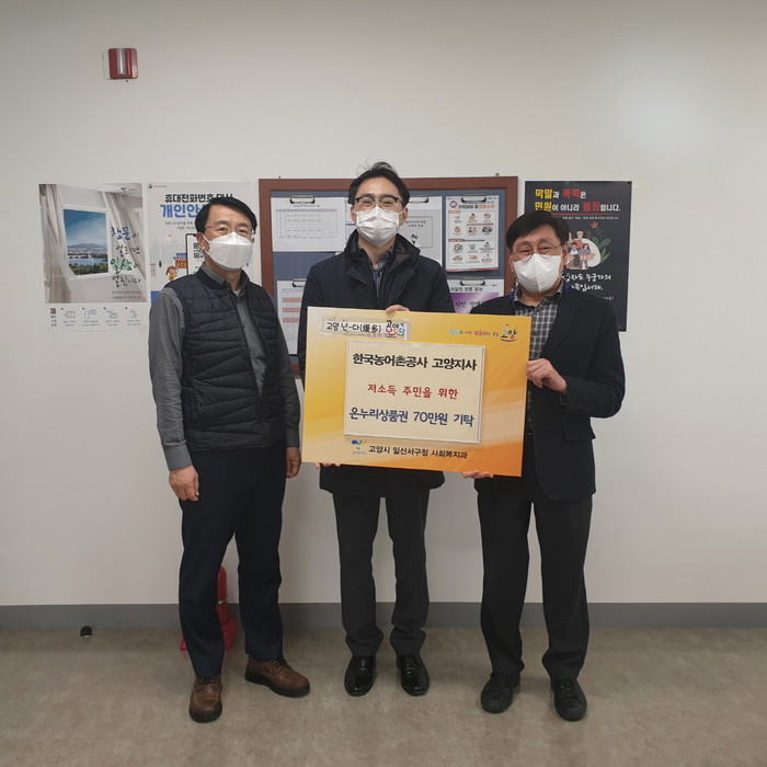 일산서구 가좌동에 위치한 한국농어촌공사 고양지사(지사장 박영욱)는 작년에 이어 올해도 어려운 이웃을 위해 조금이나마 도움을 드리고 싶다며 온누리 상품권 1만원권 70매를 기탁했다.