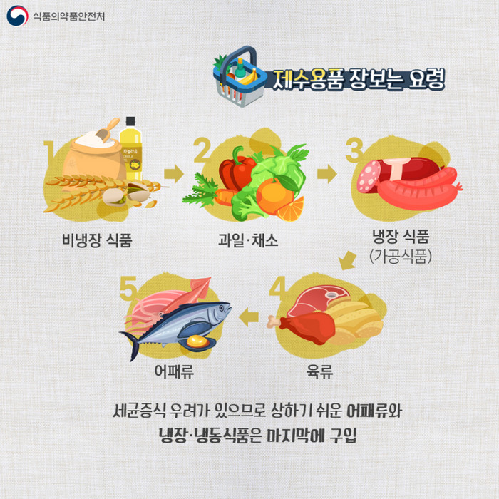 명절 음식 재료를 준비할 때부터 관심을 기울어야 한다. 온라인으로 구매한다면, 택배 도착 시 최대한 빨리 음식 재료의 이상 여부를 확인해 냉장·냉동 보관해야 한다. 시장이나 마트에서 직접 장보기를 할 경우에는 방역수칙을 철저히 지켜 외부 활동을 하고, 세균 증식 우려가 있는 상하기 쉬운 어패류와 냉장·냉동 식품은 장보기 순서 중 맨 마지막에 구입해 바로 냉장고나 냉동고에 넣어 보관하도록 해야 한다.