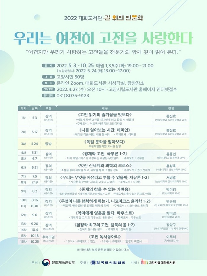 [부자동네타임즈 김인수기자] 고양시 대화도서관이 고전 인문학 프로그램 우리는 여전히 고전을 사랑한다을 운영을 앞두고 4월 27일부터 참가자를 모집한다.