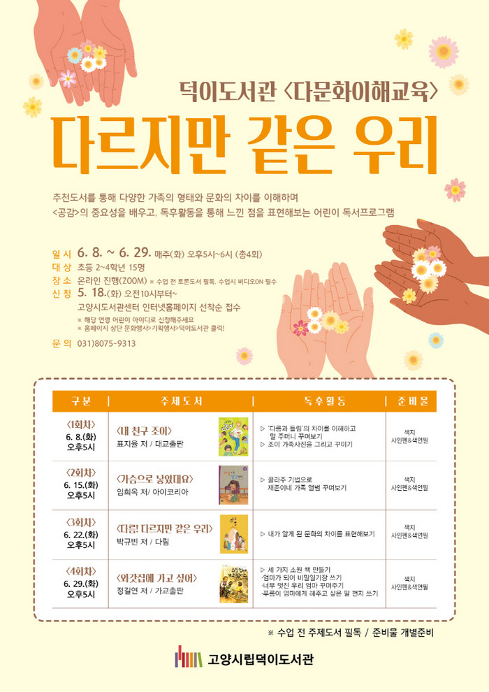 [부자동네타임즈 김인수기자] 고양시 덕이도서관에서는 다문화 이해 교육 ‘다르지만 같은 우리’를 오는 6월 8일부터 온라인으로 진행한다.