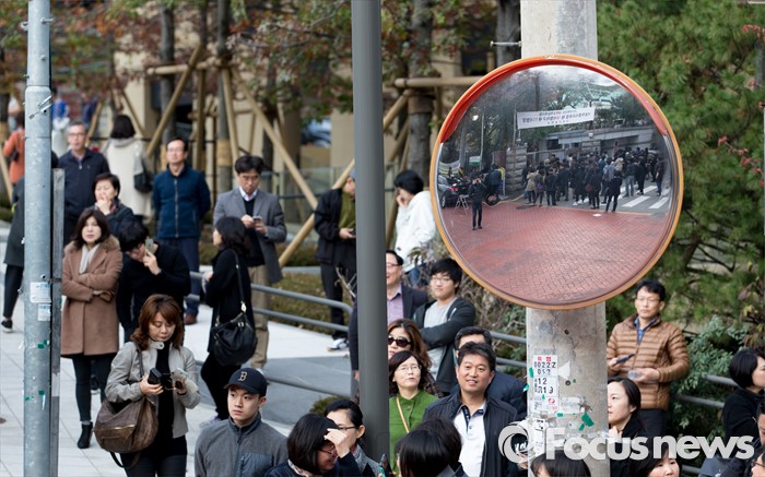(서울=포커스뉴스) 12일 오후 서울 서초고등학교 정문 앞에서 학부모들이 2016학년도 대학수학능력시험을 치르는 수험생들을 기다리고 있다.
