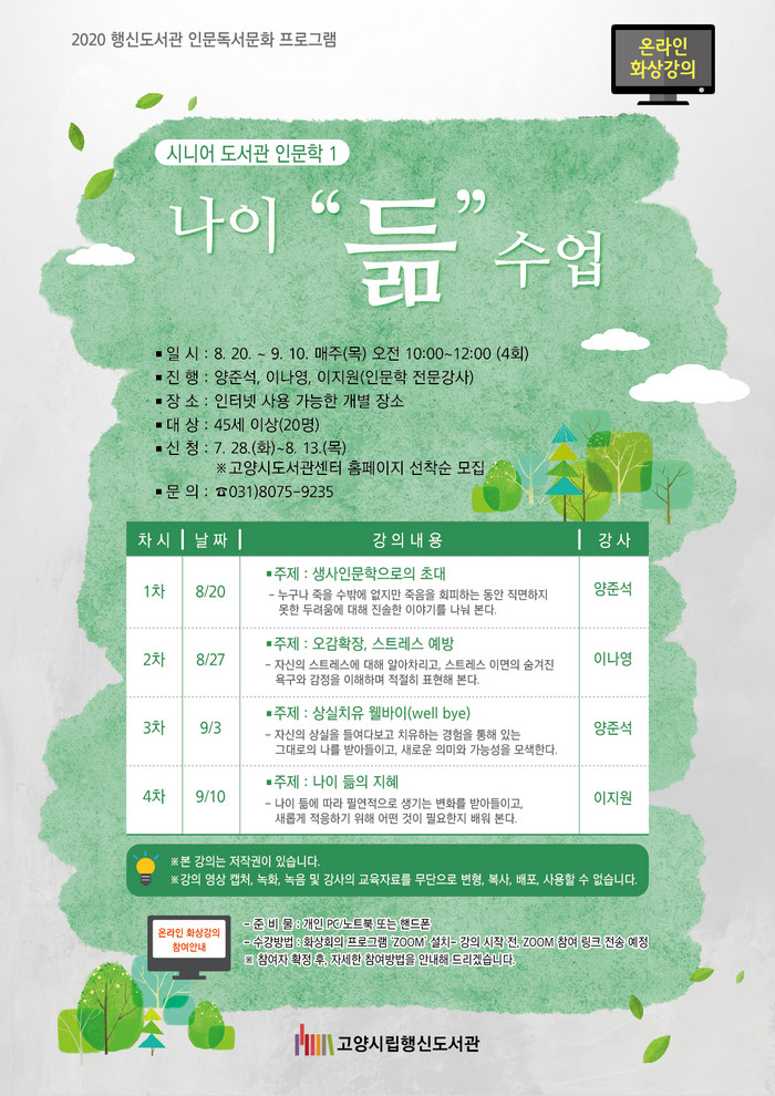 45세 이상 고양시민을 대상으로 한 이 프로그램의 참여를 원하는 사람은 고양시도서관센터 홈페이지를 통해 온라인으로 신청하거나 방문 및 전화로 신청할 수 있다. 1차 강좌 ‘나이 듦 수업’은 지난 7월 28일부터 선착순으로 참여 신청을 받고 있다.
