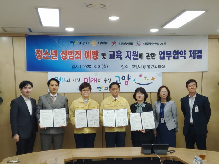 [부자동네타임즈 김인수기자] 고양시는 고양시의회, 고양교육지원청, (사)한국사이버보안협회와 지난 8일 이재준 고양시장, 이윤승 고양시의회의장, 최승천 교육장, 김현걸 협회장이 참석한 가운데 청소년 성범죄 예방 및 교육 지원에 관한 업무 협약을 체결했다고 밝혔다.