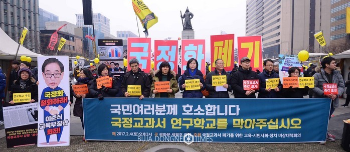 4일 서울 광화문광장에서 열린 국정교과서 연구학교 지정 중단을 촉구하는 대국민호소 기자회견에서 참석자들이 교육부의 연구학교 강행 중단을 촉구하고 있다. 2017.02.04
