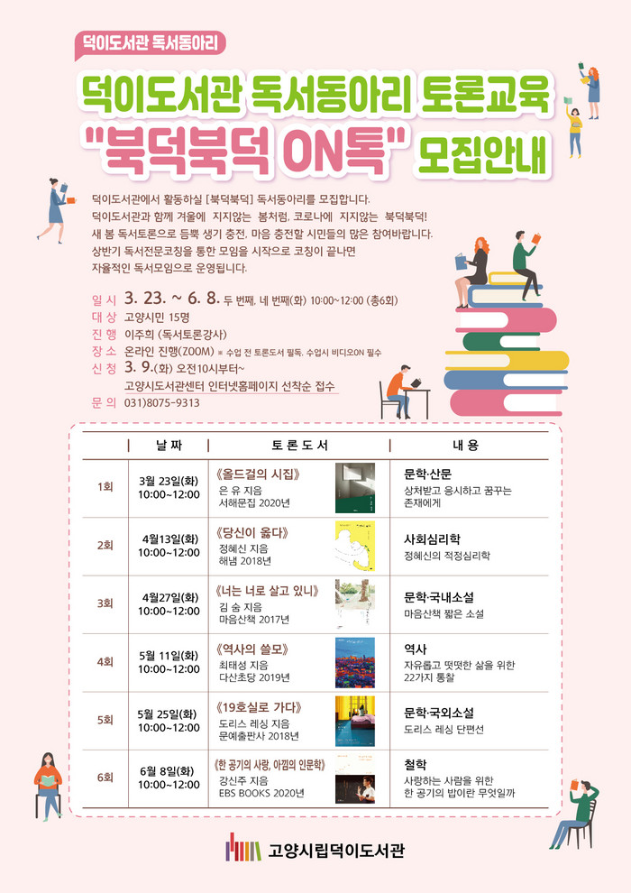 [부자동네타임즈 김인수기자] 고양시 덕이도서관에서는 새 봄을 맞이해 오는 3월 23일부터 독서동아리 모임 ‘북덕북덕 ON톡’을 운영한다.