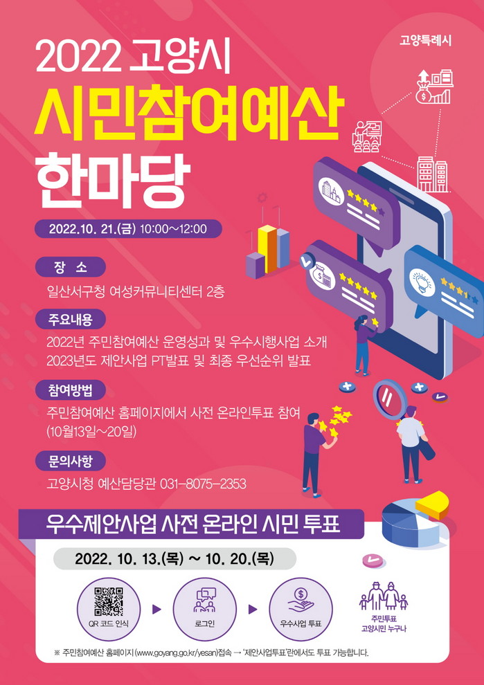 [부자동네타임즈 김인수기자] 고양특례시(시장 이동환)가 오는 21일 오전 10시부터 일산서구청 여성커뮤니티센터(2층)에서 ‘고양시 시민참여예산 한마당’을 개최한다.