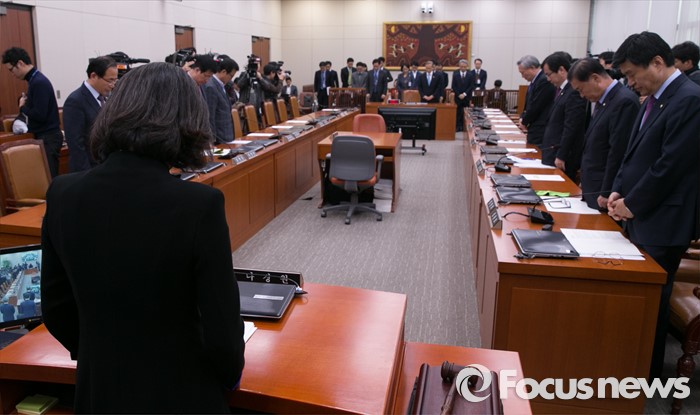 | △ 17일 오후 서울 여의도 국회 외교통일위원회 회의실에서 열린 프랑스 파리 테러사태 관련 간담회에 참석한 여야 의원들과 임성남 외교부 1차관이 희생자들을 추모하는 묵념을 하고 있다. <사진제공=포커스뉴스> |