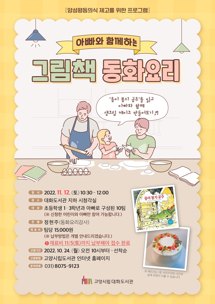 [부자동네타임즈 김인수기자] 고양특례시(시장 이동환) 대화도서관이 11월 12일 양성평등의식 제고를 위한 프로그램 아빠와 함께하는 그림책 동화요리를 운영한다.