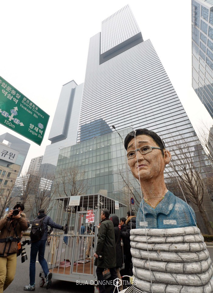 이들은 오후 3시35분께 삼성전자 서초사옥 앞에 도착한 뒤 마무리 집회를 열고 이 부회장 구속 퍼포먼스와 재벌구속 촉구를 주장하는 발언 등을 이어갔다.