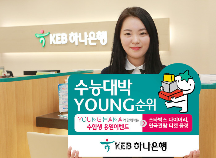 [부자동네타임즈 이현재 기자]KEB하나은행은 대학수학능력시험을 치른 수험생들을 대상으로 은행의 유스(Youth)브랜드 영하나(YOUNGHANA)와 연계한 「수능대박 YOUNG순위」이벤트를 16일부터 오는 12월말까지 진행한다고 밝혔다.