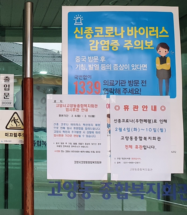 [부자동네타임즈 김인수기자] 고양시(시장 이재준)는 신종 코로나바이러스 감염 예방 및 확산 차단을 위해 지난 4일부터 2월 10일까지 관내 동종합복지회관 8곳을 임시휴관한다고 밝혔다.