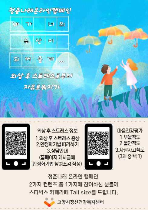[부자동네타임즈 김인수기자] 고양시정신건강복지센터 청춘나래팀이 11월 23일까지 온라인 정신건강 캠페인 ‘내가 너의 우산이 되어줄게’를 진행한다.