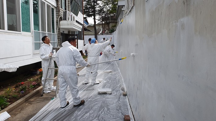 이날 봉사활동으로 이끼가 끼어있던 빌라 외부담장이 새하얗게 변신했고 구청 지원으로 경로당 외벽도 깔끔하게 단장을 마쳤다.