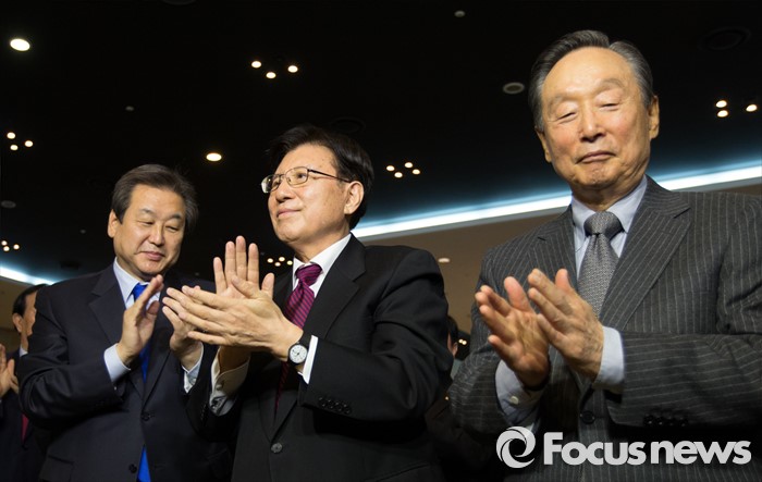 (서울=포커스뉴스) 30일 오후 김영삼 전 대통령의 상도동계와 김대중 전 대통령의 동교동계가 함께 설립한 민주화추진협의회(민추협)가 서울 여의도 중소기업 중앙회에서 송년회를 열었다. 송년회에서 만세 삼창을 한 후 김무성(왼쪽 부터) 한나라당 대표, 김덕룡, 권노갑 공동이사장이 박수를 치고 있다.