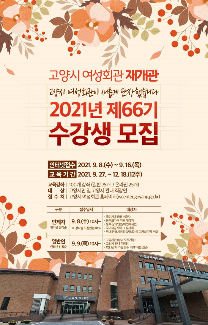 [부자동네타임즈 김인수기자] 고양시 여성회관이 재개관을 앞두고 2021년 하반기 제66기 정규 강좌 수강생을 모집한다. 고양시민이라면 남녀 모두 신청할 수 있다.