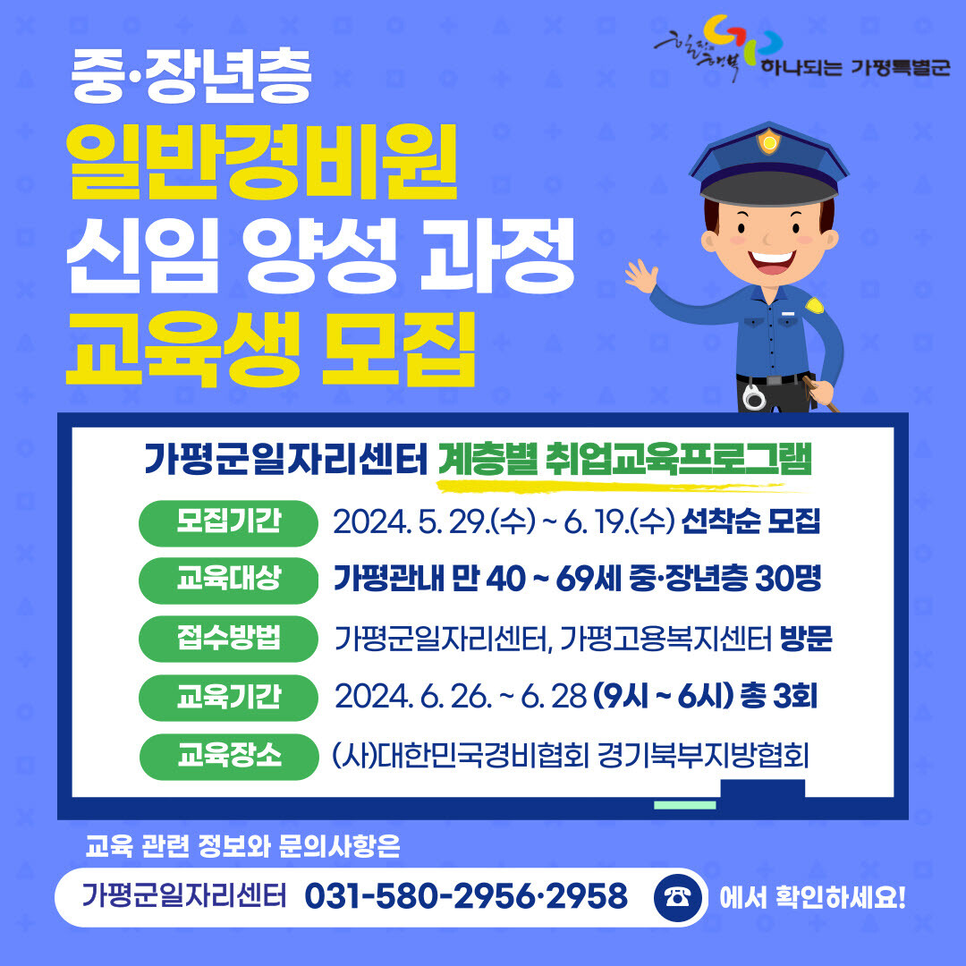 ‘일반경비원 신임 양성 과정’ 교육생 모집에 대한 문의는 가평군일자리센터(☎031-580-2958, 2956)로 하면 된다.