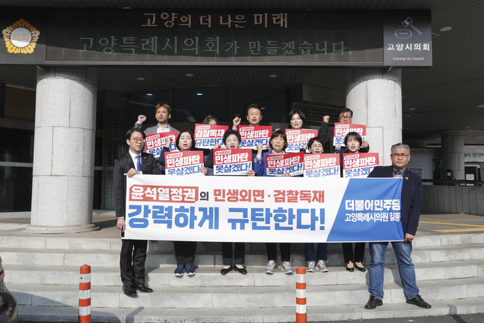 [부자동네타임즈 김인수기자] 고양특례시의회 더불어민주당의원 일동은 최근 국민주권과 민주공화국 정신을 훼손하는 윤석열정부의 야당탄압과 경제 분야에 있어 역대 가장 무능한 정책으로 민생파탄이 펼쳐지고 있는 현실에 경종을 울리고자 이 자리에 섰습니다.