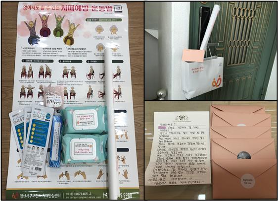 이번에 전달된 ‘건강꾸러미’는 코로나19를 예방할 수 있는 손세정제, 마스크, 물티슈, 장갑 등이 포함돼 있으며, 집에서 따라할 수 있는 ‘치매예방운동 포스터’와 감염에 취약한 어르신들의 방역을 위한 개인 행동수칙도 함께 동봉했다. 또한, 센터 직원들이 직접 마음을 담아 쓴 ‘희망손편지’를 전달해 어르신들의 외롭고 고립된 마음을 살피고 지지했다.