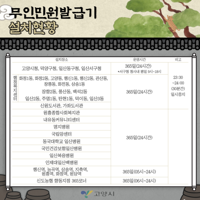 고양시청, 각 구청, 동 행정복지센터 등 총 39개소에 설치되어 있는 무인민원발급기가 설 연휴 기간에도 정상 운영되며, 주민등록·병무·지방세·부동산·가족관계·교육·건강보험 등 15개 분야 총 113종의 서류 발급 서비스를 제공한다.