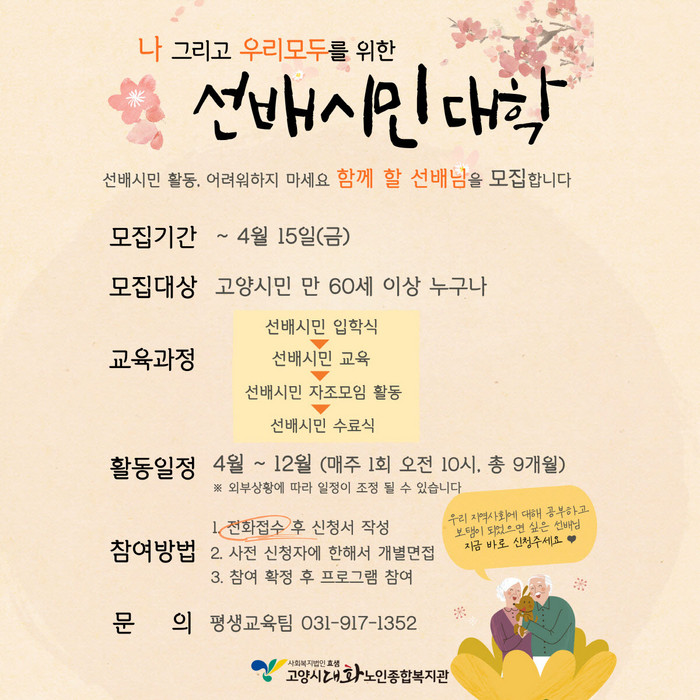 참여 신청 및 선배시민대학 관련한 자세한 사항은 고양시대화노인종합복지관 평생교육팀으로 문의하면 된다.