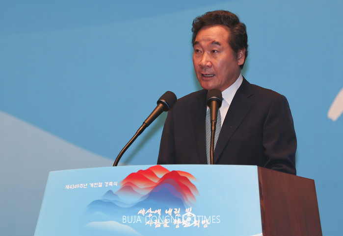 이 총리는 이날 세종문화회관에서 열린 제4393주년 개천절 기념식 기념사에서 "남북한 공통의 경축일인 개천절에도 한반도의 군사적 긴장은 계속되며 단군께서 하늘을 여신 뜻마저 흔들려 하고 있다"며 이같이 말했다.