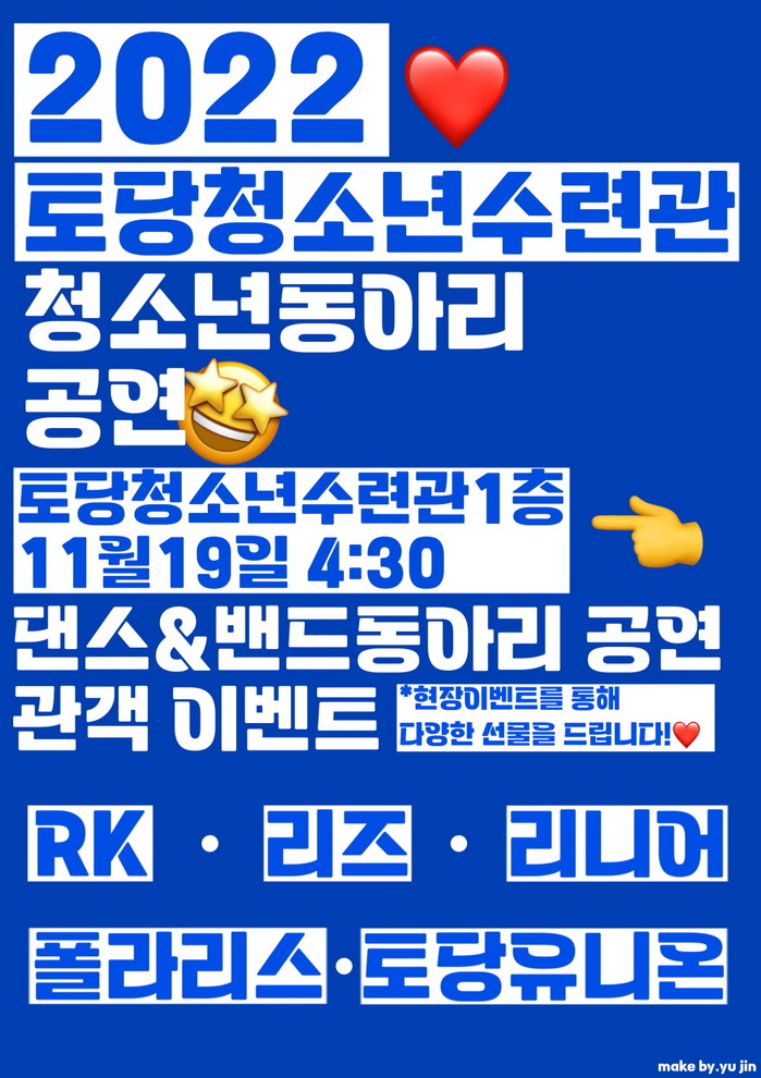 세부내용으로는 ▲청소년동아리 공연 ▲관객 이벤트 ▲우수동아리 시상이 진행되며 청소년동아리 공연은 토당청소년수련관 소속 밴드, 댄스동아리 등 총 7팀이 참여한다. 청소년동아리가 직접 준비한 연주와 안무들을 만나볼 수 있으며, 댄스동아리 연합활동팀 ‘토당유니온’이 함께 참여하여 무대를 빛낸다.