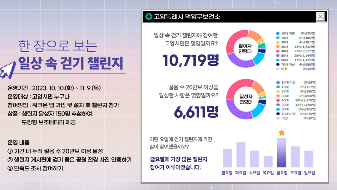 총 10,719명의 고양시민이 ‘일상 속 걷기 챌린지’에 참가했다. 참가자들은 모바일 걷기 앱인 워크온을 이용해 일상생활 속 걷기 습관을 실천했다. 전체 참여자들의 총 걸음 수는 총 1,813,094,630보였다. 한 사람당 평균 169,148보를 걸은 셈이다.