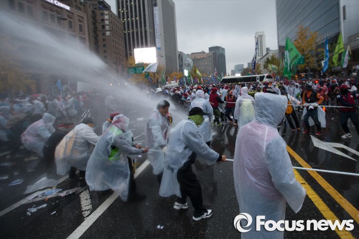 | △ 지난 14일 오후 서울 종로구 세종대로에서 열린 정부 규탄 '민중총궐기 투쟁대회'에서 경찰이 시위대를 향해 물대포를 쏘고 있다. <사진제공=포커스뉴스> |