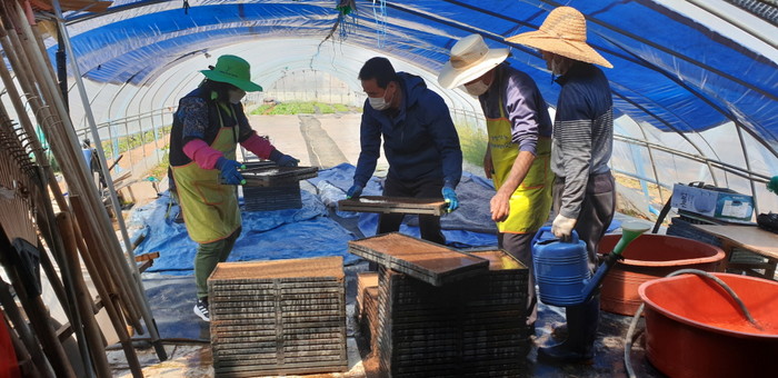 정발산동 최성연 동장 및 주민자치위원 15명은 대화농장(일산서구 대화동 1673-8)을 방문해 용마름 재료로 사용될 볏짚을 위한 모판 물 뿌리기, 볍씨 뿌리기 작업을 완료했다.