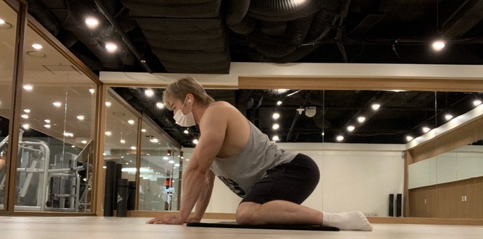 바닥에 다리를 틀어 앉아준 후 엉덩이를 들어 정면으로 밀어준다는 느낌으로 상체를 세우며 무릎으로 일어난다. 세트 3set. 횟수 왕복 10회.