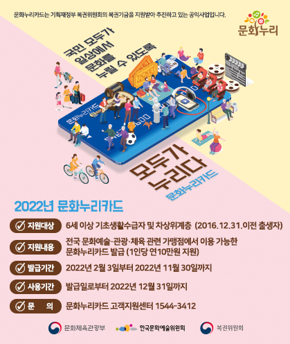 시 관계자는“문화향유 기회 제공을 위한 문화누리카드 지원을 확대한 만큼, 대상자들이 문화누리카드를 사용하여 다양한 분야에서 문화생활을 누리길 바란다.”고 밝혔다.