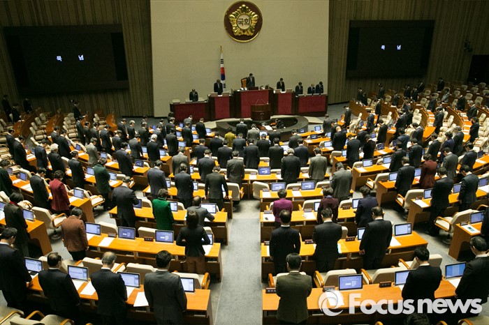 | △ 30일 오후 서울 여의도 국회의사당에서 개의한 제337회 국회(정기회) 제12차 본회의에서 본격적인 의사진행에 앞서 고 김영삼 전 대통령의 서거를 기리는 묵념을 하고 있다. <사진제공=포커스뉴스> |