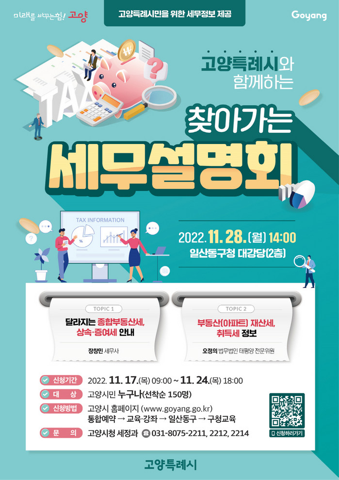 이동환 고양특례시장은 “이번 설명회를 통해 시민들이 생활 속에서 실질적으로 도움이 되는 세무정보, 절세방안 등을 배우시기 바란다.”고 밝혔다.