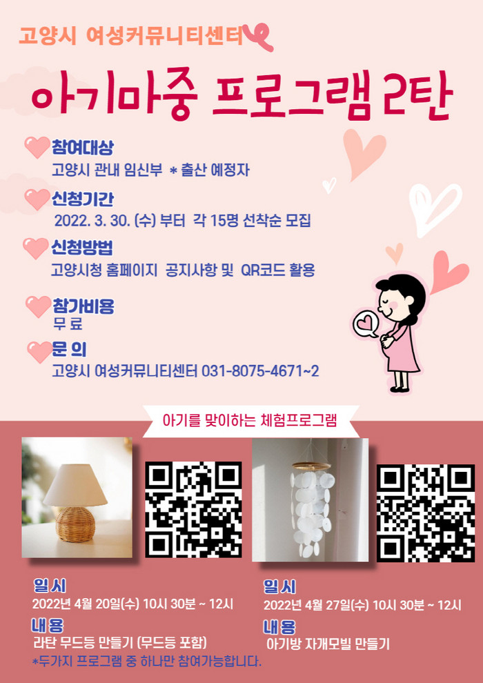 [부자동네타임즈 김인수기자] 고양시 여성커뮤니티센터가 관내 임신부를 위해 4월 20일과 27일 아기마중 프로그램을 운영한다. 이번에는 아기 방 꾸미기에 필요한 물품(라탄 무드등, 자개모빌) 만들기를 진행한다.