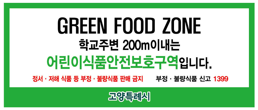 어린이 식품안전보호구역은 학교와 해당 학교의 경계선으로부터 직선거리 200미터의 범위 안의 구역을 말한다. 어린이 식품안전보호구역(Green Food Zone) 지정 표지판은 학교 정문과 후문 근처 및 학교로 이어지는 도로 등에 설치하도록 규정되어 있다.