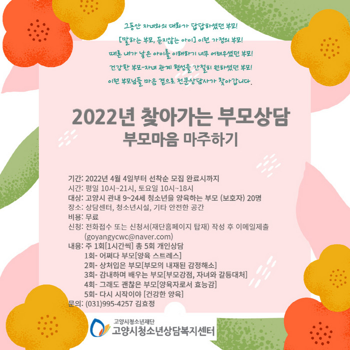 [부자동네타임즈 김인수기자] 고양시청소년재단이 운영하는 고양시청소년상담복지센터(센터장 황상하)는 4월부터 양육스트레스 해소와 부모 효능감 강화 프로젝트 찾아가는 부모상담을 진행한다고 밝혔다.
