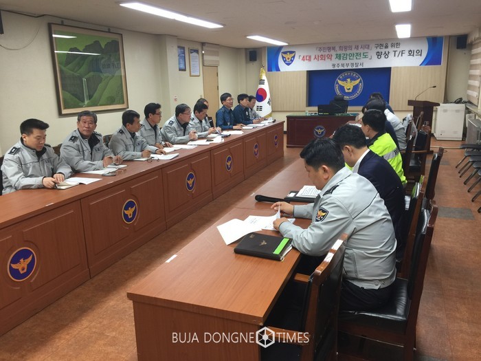 북부경찰서(서장 임광문)에서는 광주북부경찰서 2층 소회의실에서 여성창소년과를 중심으로 각 기능 계장 및 지구대장 등 16명과 함께 2017년 4대 사회악체감안전도 향상을 위한 T/F회의를 개최했다.