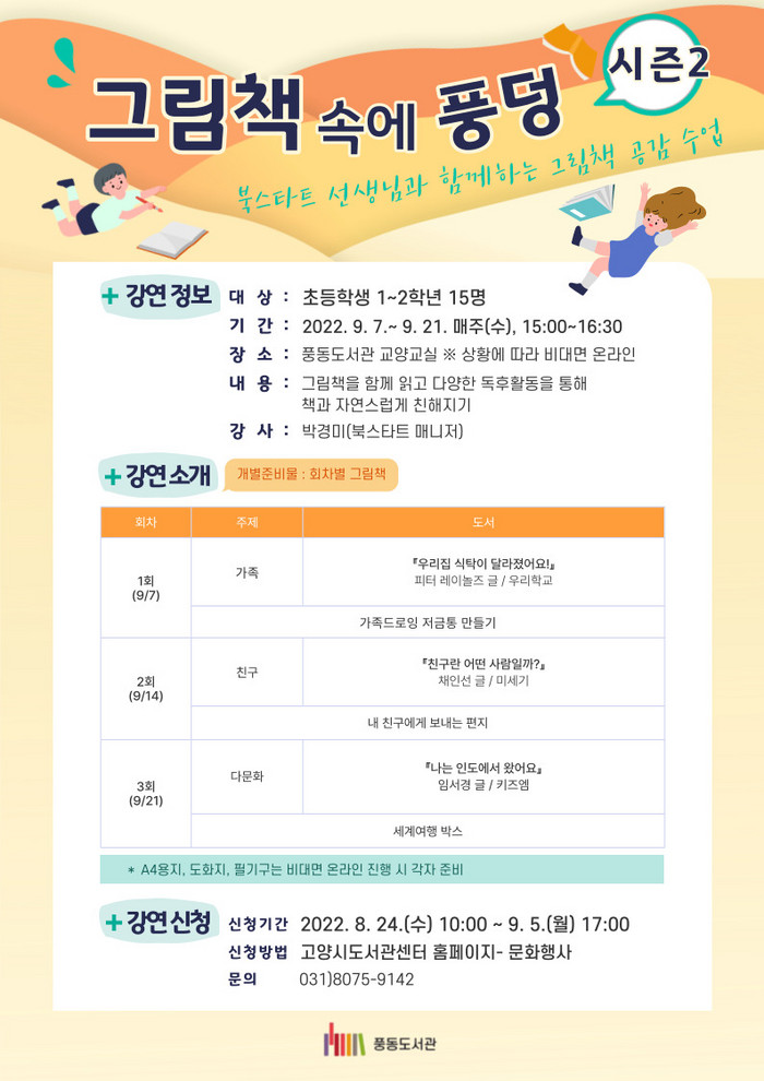 [부자동네타임즈 김인수기자] 고양특례시(이동환 시장) 풍동도서관이 9월 7일(수)부터 9월 21일(수)까지 3회에 걸쳐 초등학생 1~2학년을 대상으로 그림책 공감 수업 ‘그림책 속으로 풍덩 시즌2’를 진행한다.