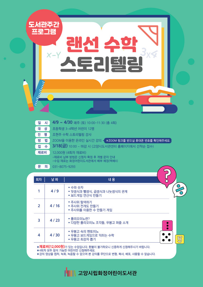 [부자동네타임즈 김인수기자] 고양시 화정어린이도서관은 도서관 주간을 맞이해 어린이들을 위한 랜선 수학 스토리텔링 프로그램을 운영한다고 밝혔다.