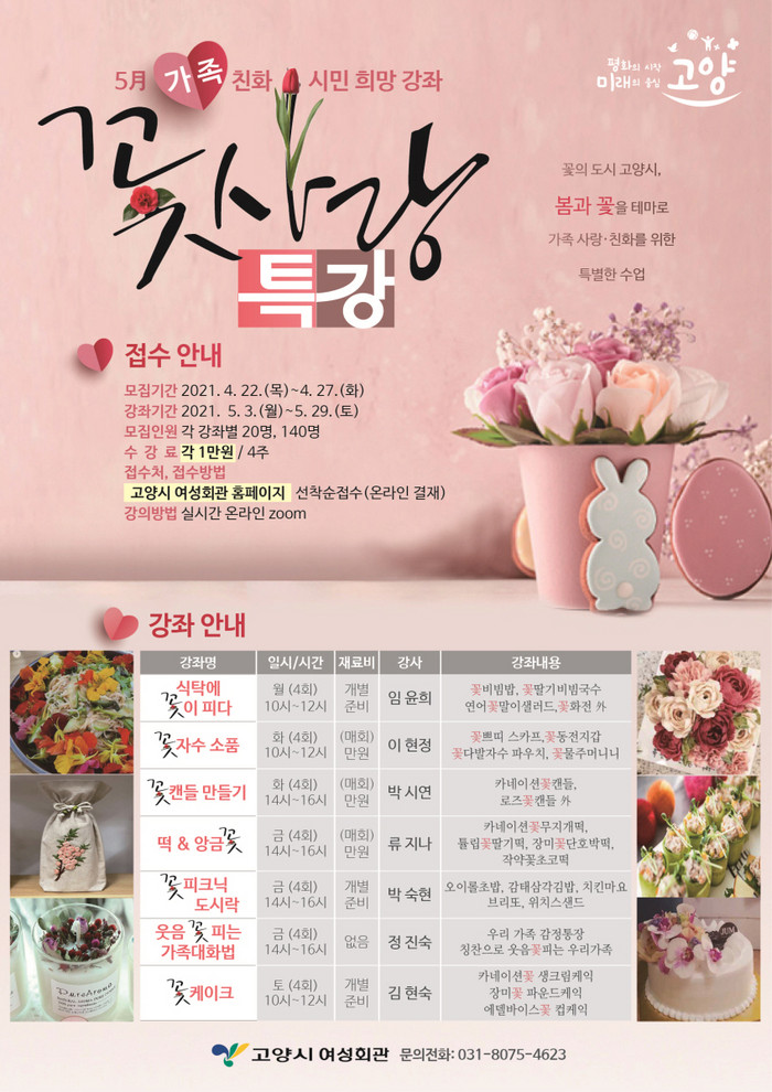 고양시 여성회관은 ‘가족 대상 희망 강좌’에 관한 자체 설문 조사를 사전에 실시해 시민들의 수요가 많았던 강좌들을 봄과 꽃 테마로 해서 이번 특강을 기획했다.