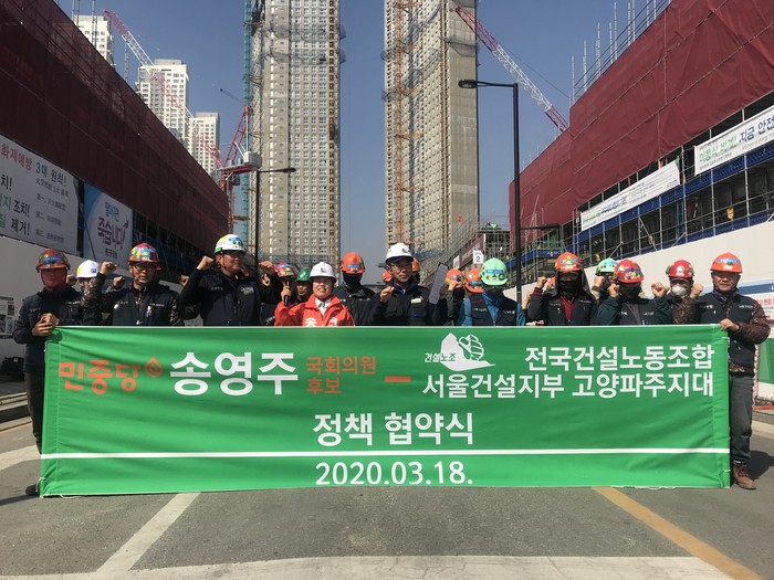 송영주 후보와 건설노조는 ‘노동기본권 보장’, ‘원하청 공동사용자책임제 도입’, ‘지역주민 우선고용 촉진법 제정’, ‘건설노동자 주휴수당 보장과 퇴직공제금 1만원’, ‘고양파주 건설기능교육기관 설립’ 등을 위해 공동 협력하기로 약속했다.