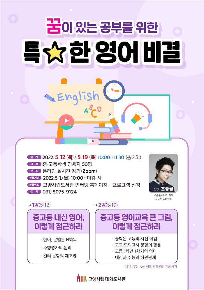 [부자동네타임즈 김인수기자] 고양시 대화도서관은 오는 5월 12일 목요일 오전 10시부터 학부모 대상 진로독서 프로그램 꿈이 있는 공부를 위한 특별한 영어 비결을 온라인으로 운영한다.