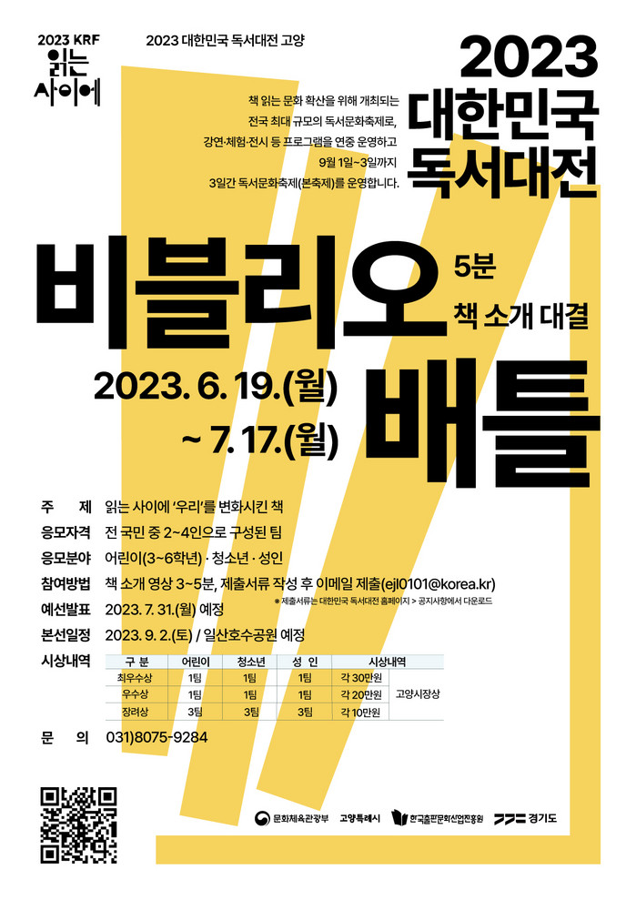 [부자동네타임즈 김인수기자] 오는 6월 19일부터 7월 17일까지 ‘2023 대한민국 독서대전’에서 개최될 비블리오 배틀의 참가자를 모집한다. 이번 대결의 주제는 읽는 사이에 ‘우리’를 변화시킨 책이다.