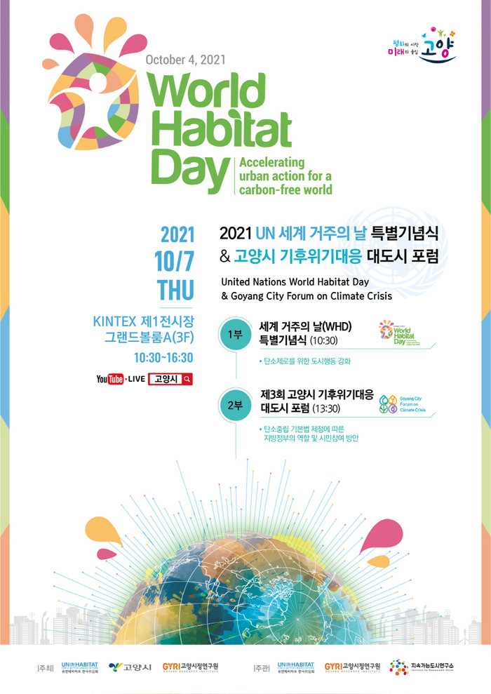 이에 세계 거주의 날과 탄소중립법 제정을 기념하기 위해 고양시가 UN해비타트 한국위원회, 고양시정연구원 공동으로 행사를 준비했다. 1부는 세계 거주의 날 특별 기념식을 진행하고 2부는 탄소중립기본법 제정에 따른 지방정부의 역할 및 참여 방안을 논의할 계획이다.