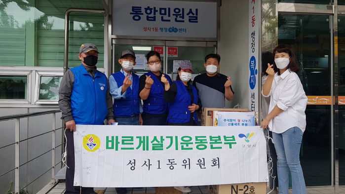 [부자동네타임즈 김인수기자] 고양시 덕양구 성사1동행정복지센터(동장 왕연우)는 "지난 7일 바르게살기위원회(위원장 유재철)가 따뜻한 추석을 맞이하기 위해 지역 내 어려운 이웃들에게 80만원 상당의 추석맞이 선물세트를 후원했다."고 밝혔다.