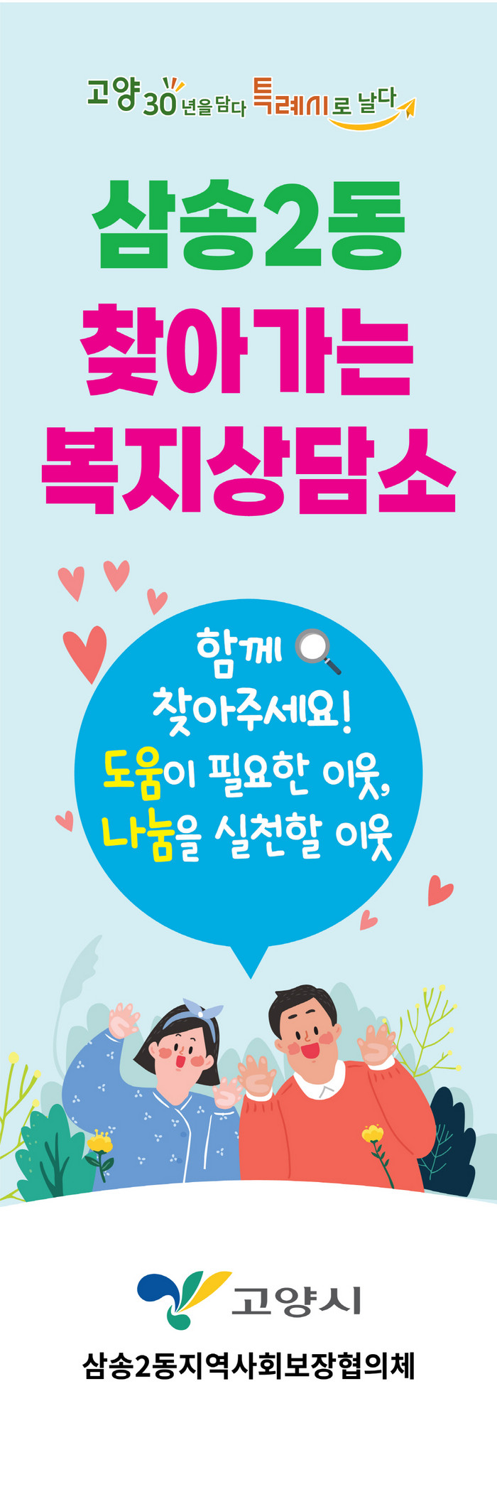[부자동네타임즈 김인수기자] 고양시 삼송2동행정복지센터(동장 양재관)가 오는 4월 4일부터 찾아가는 복지상담소를 운영한다. 삼송2동 찾아가는 복지상담소는 삼송마을 18단지를 시작으로 월 1회, 관내 공동주택 등 주민이 방문하기 쉬운 곳에서 운영된다.