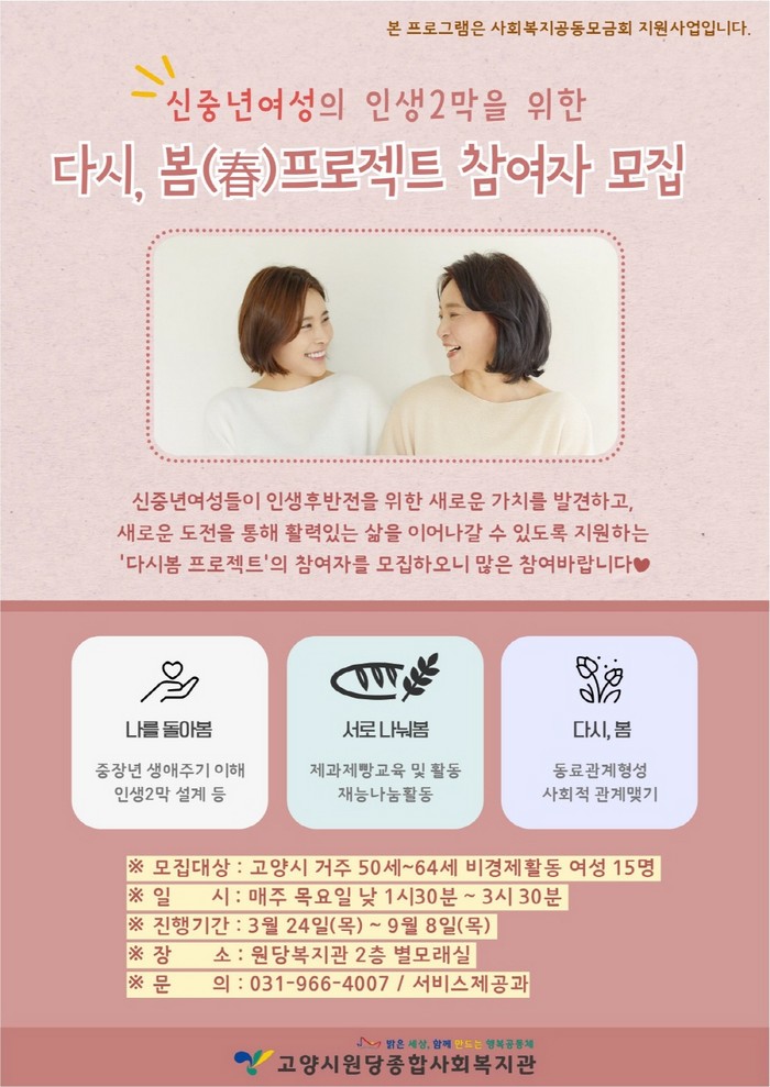 [부자동네타임즈 김인수기자] 고양시원당종합사회복지관(관장 황의철)이 사회복지공동모금회 지원으로 신중년 여성들의 인생 2막을 지원하는 ‘다시, 봄(春) 프로젝트’를 진행한다.
